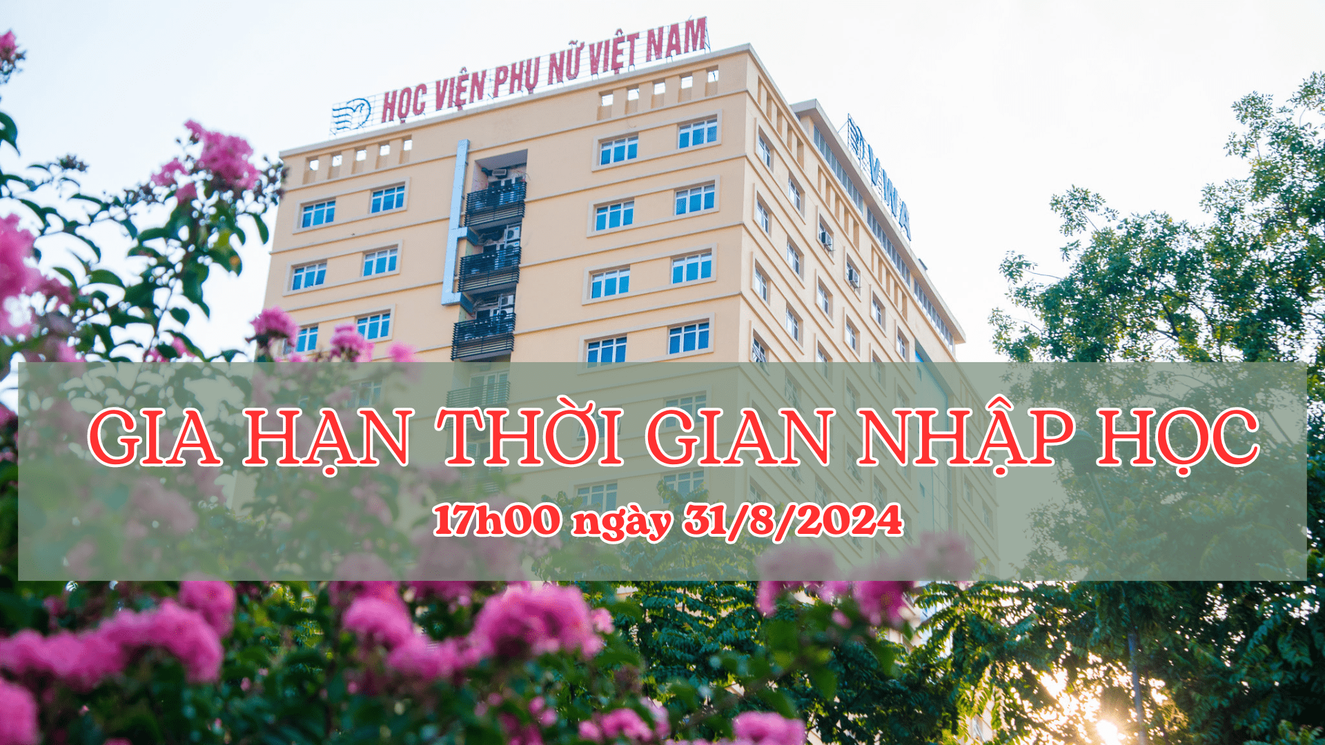 Căn cứ Thông báo mới nhất của Vụ Giáo dục đại học, Bộ Giáo dục và Đào tạo (ngày 28/8/2024) về công tác tuyển sinh đại học năm 2024, Học viện Phụ nữ Việt Nam thông báo gia hạn thời gian xác nhận nhập học và nhập học vào Học viện Phụ nữ Việt Nam năm học 2024 – 2025 cụ thể như sau: