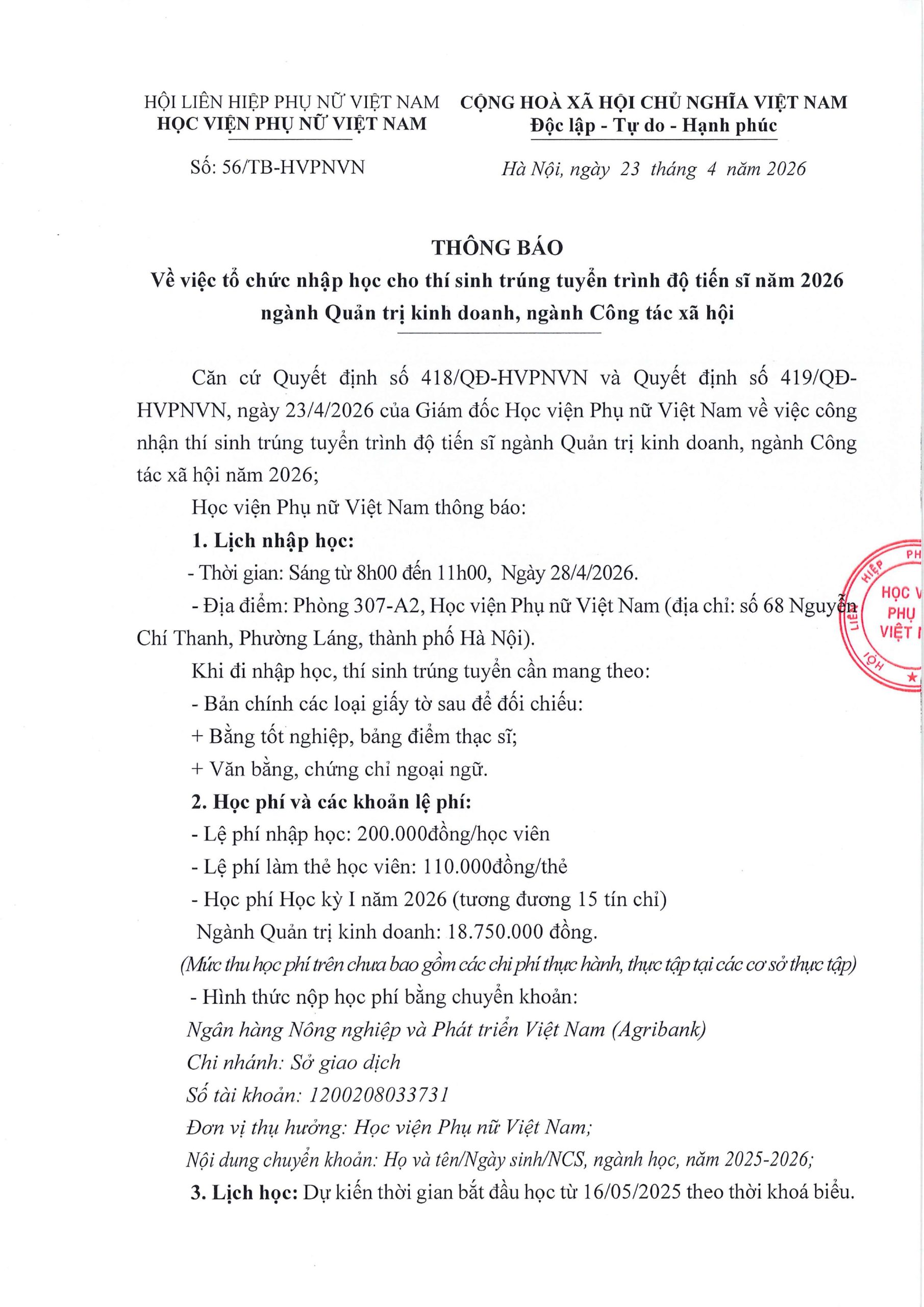 Sau khi có Quyết định phê duyệt điểm trúng tuyển, Quyết định công nhận thí sinh trúng tuyển đào tạo trình độ Tiến sĩ CTXH và QTKD năm 2026, Học viện Phụ nữ Việt Nam thông báo về việc tổ chức nhập học cho các thí sinh trúng tuyển trình độ Tiến sĩ.