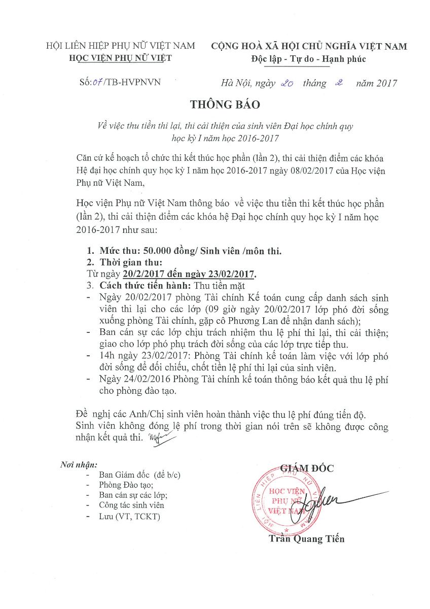 Thu tiền thi lại, thi cải thiện của sinh viên đại học chính quy học kỳ I năm học 2016-2017