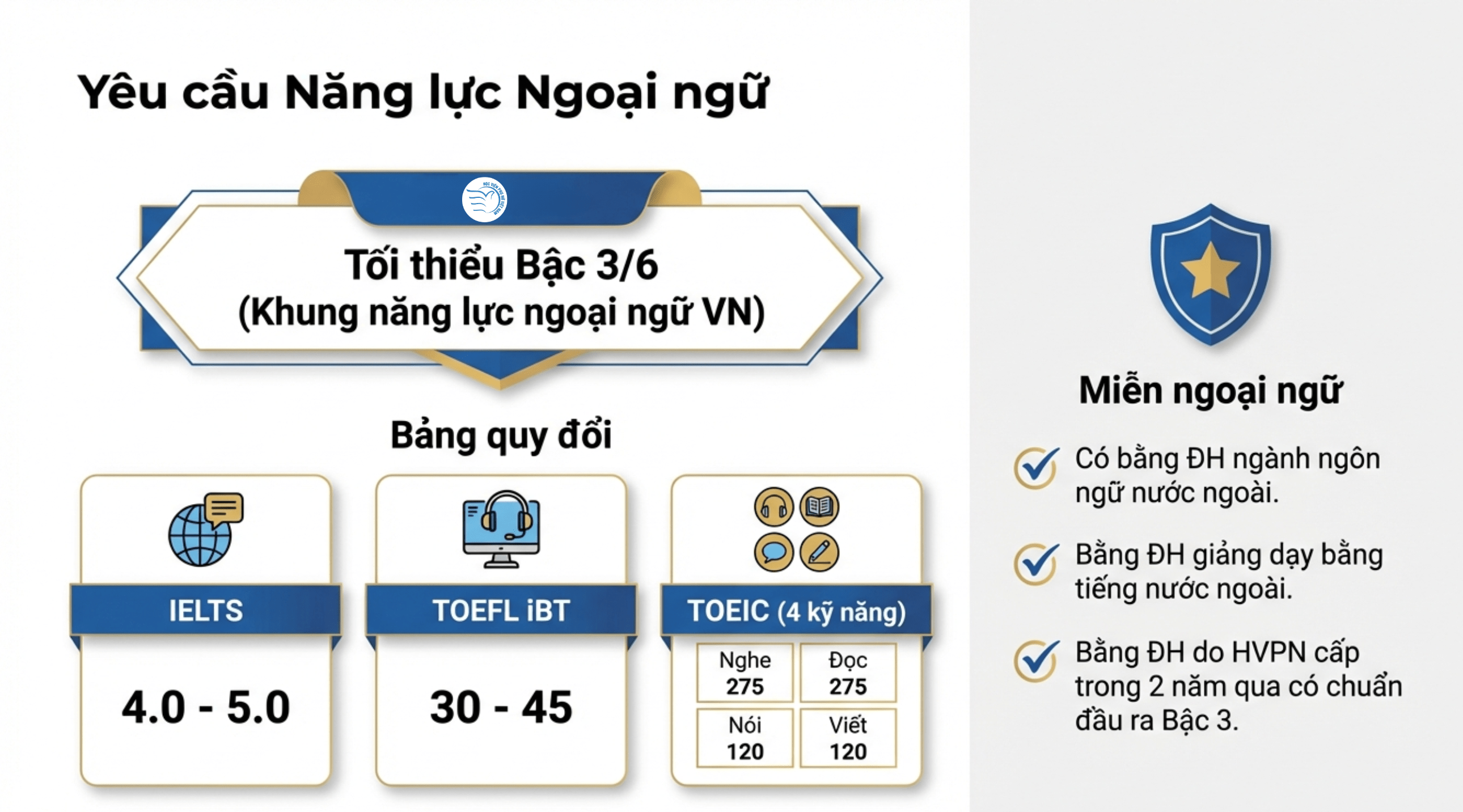 Học viện cũng miễn yêu cầu này cho những người đã có bằng đại học ngành ngôn ngữ nước ngoài hoặc người mới tốt nghiệp đại học tại Học viện trong vòng 2 năm mà chuẩn đầu ra đã đạt Bậc 3 trở lên.