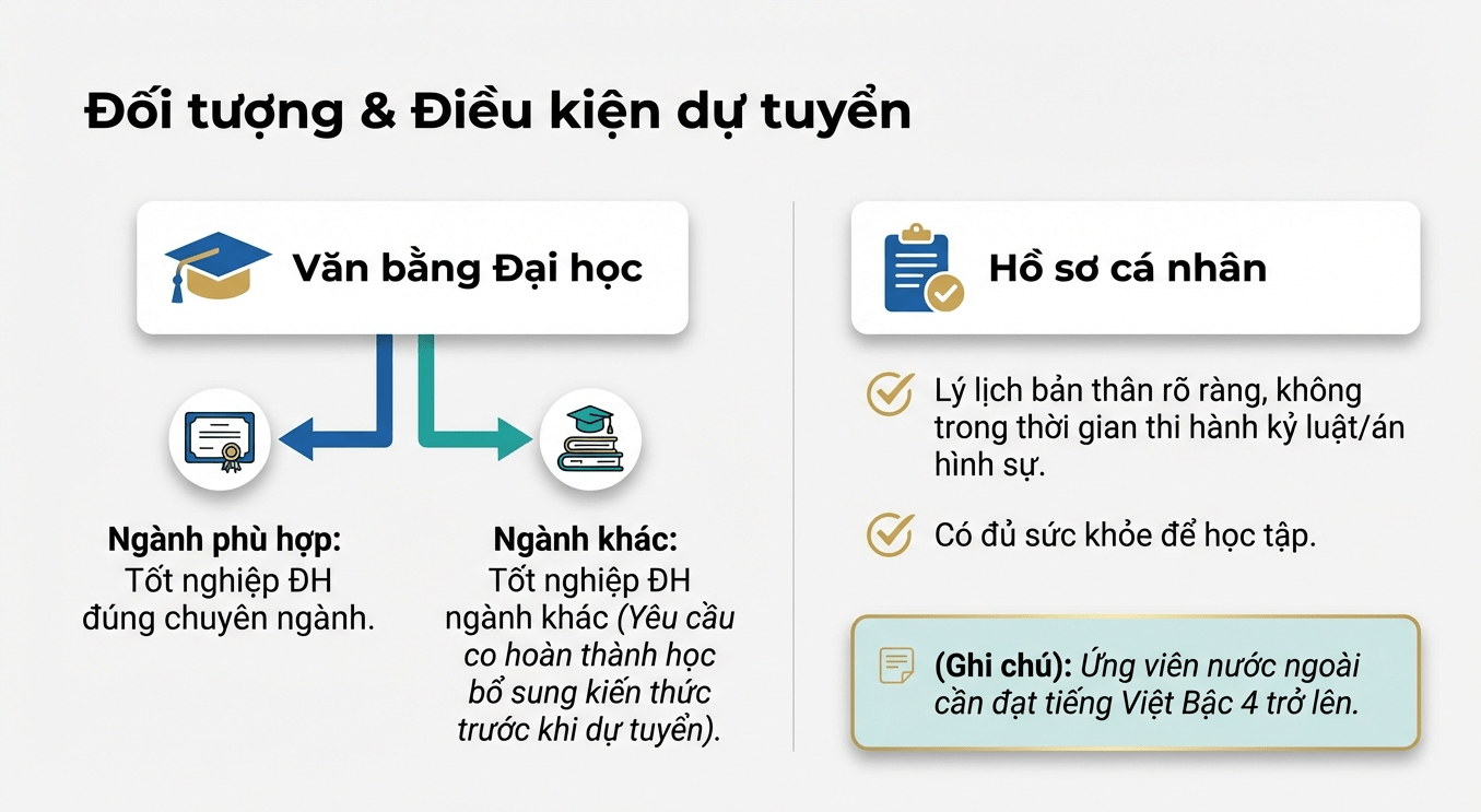 Nhằm khuyến khích những cá nhân có thành tích học tập xuất sắc, Học viện dành cơ hội xét tuyển thẳng cho thí sinh tốt nghiệp đại học trong vòng 2 năm tính đến thời điểm tuyển sinh. Điều kiện bắt buộc là ứng viên phải đạt mức xếp loại tốt nghiệp từ loại Giỏi trở lên và đáp ứng đủ yêu cầu về năng lực ngoại ngữ. Đối với các trường hợp bằng tốt nghiệp đại học không đúng ngành, thí sinh vẫn được xét tuyển thẳng sau khi hoàn thành các học phần bổ sung kiến thức theo quy định.