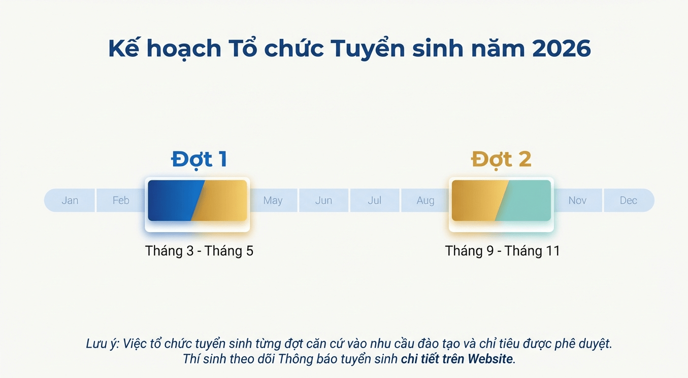 Để tạo điều kiện cho các ứng viên chủ động sắp xếp thời gian công tác và học tập, Học viện dự kiến tổ chức tuyển sinh tối đa 02 đợt trong năm 2026: