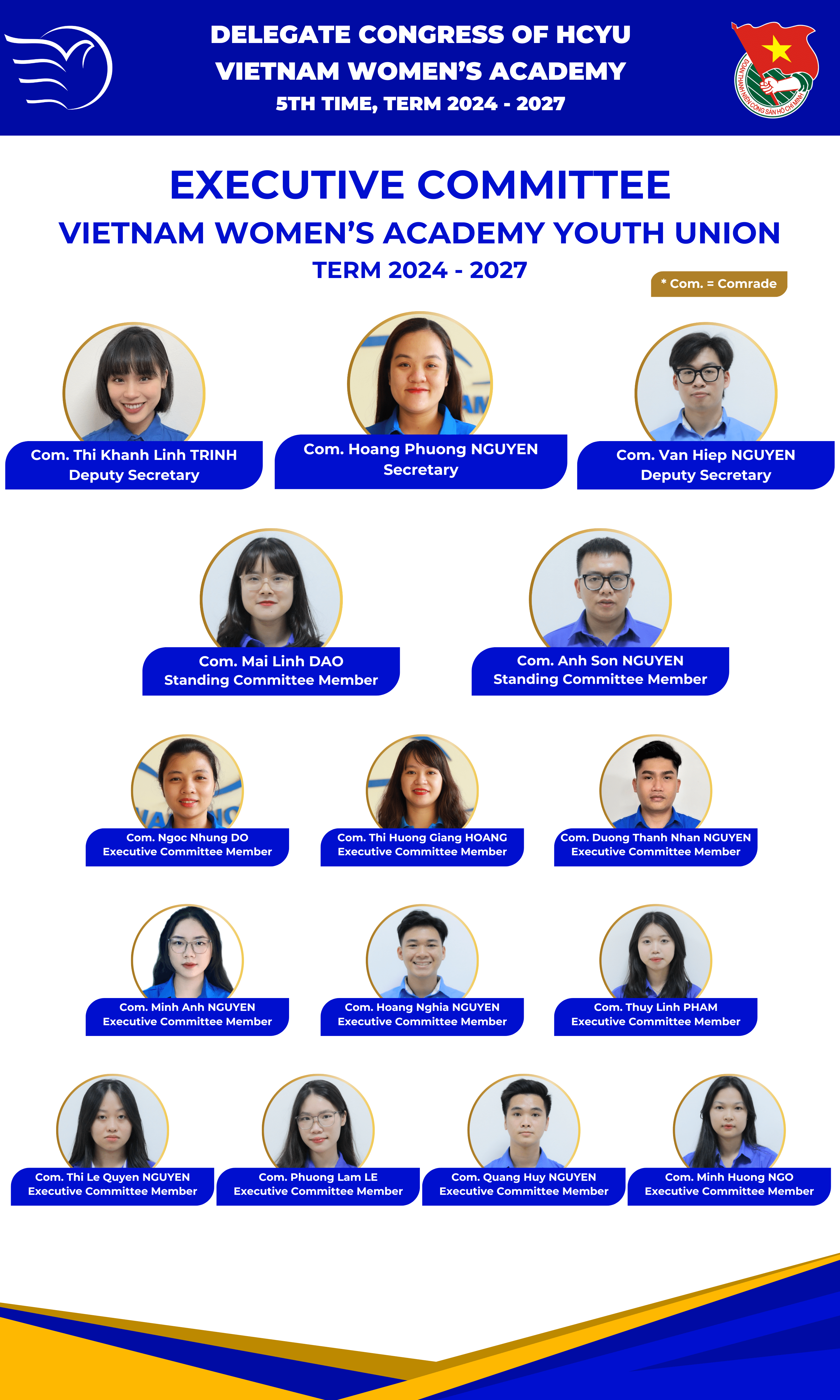 On May 25, 2023, the Delegate Congress of the Ho Chi Minh Communist Youth Union of Vietnam Women’s Academy (HCYU-VWA) for the 2024-2027 term elected 15 comrades, of which 07 are officials and 08 are students. The Standing Committee includes 05 comrades (01 Secretary; 02 Deputy Secretaries; 2 Standing Committee members who are lecturers, students, officials, and workers of VWA.