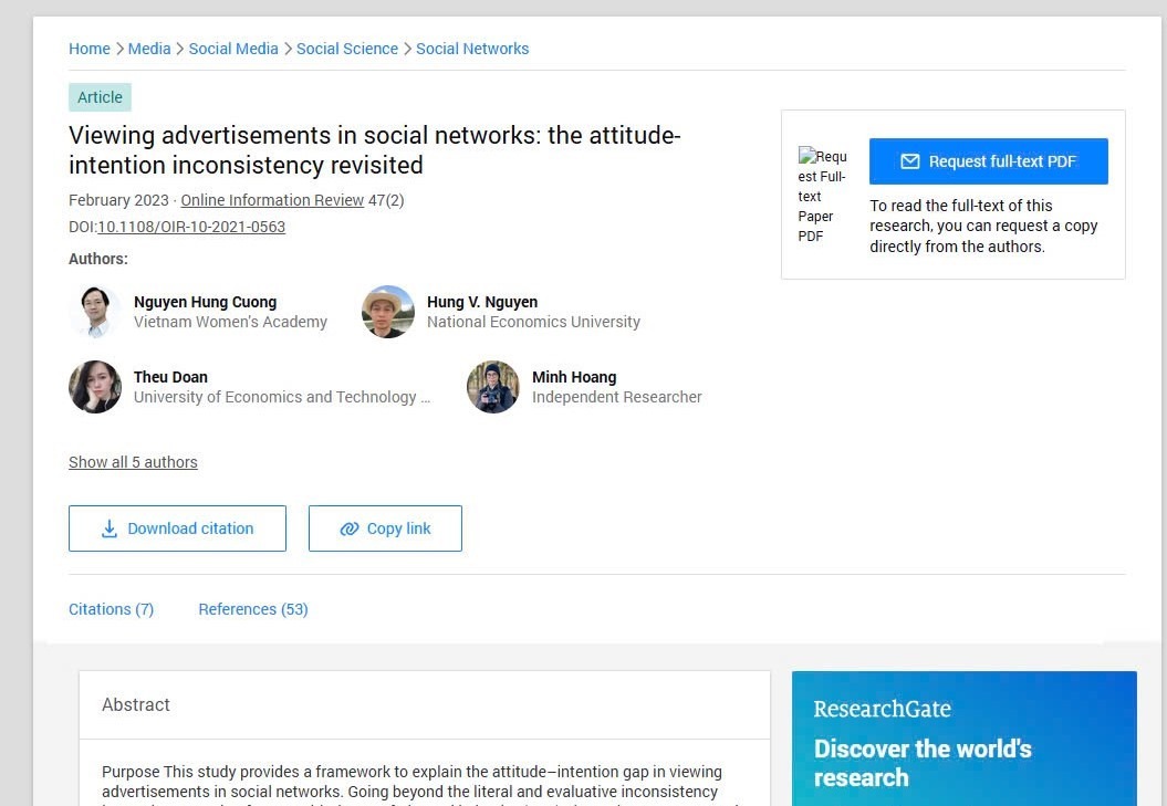 - 140 scientific journals published in domestic and international journals reflect the strong development of in-depth research. A typical example is the article “Viewing advertisements in social networks: the attitude-intention inconsistency revisited” in Online Information Review. This study builds a theoretical framework to explain the gap between attitudes and intentions in the behavior of viewing advertisements on social networks. Instead of focusing only on semantic and evaluative disagreements in measuring factors according to the Theory of Planned Behavior (TPB), the author proposes and tests a theoretical model, which considers the role of moderating factors that may influence the relationship between attitudes and behavioral intentions.