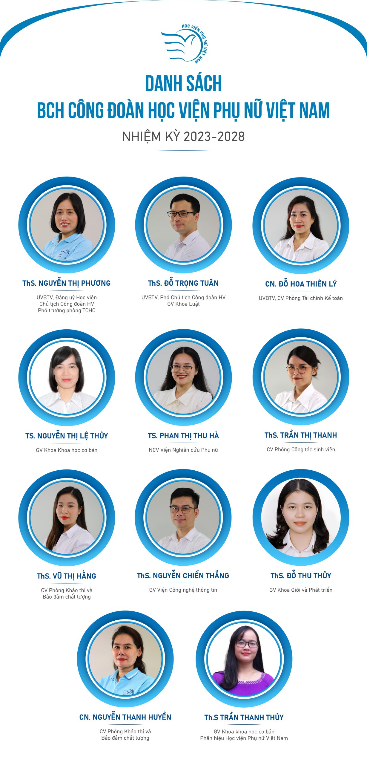 Ngày 16/3/2023, Ban Chấp hành Công đoàn Học viện nhiệm kỳ 2023-2028 được Đại hội Công đoàn Học viện Phụ nữ Việt Nam bầu với 11 ủy viên, bao gồm 01 Chủ tịch, 01 Phó Chủ tịch, 01 Ủy viên Ban Thường vụ và 08 Ủy viên Ban Chấp hành là giảng viên, viên chức, người lao động của Học viện Phụ nữ Việt Nam tại trụ sở chính ở Hà Nội và Phân hiệu tại TP. Hồ Chí Minh.