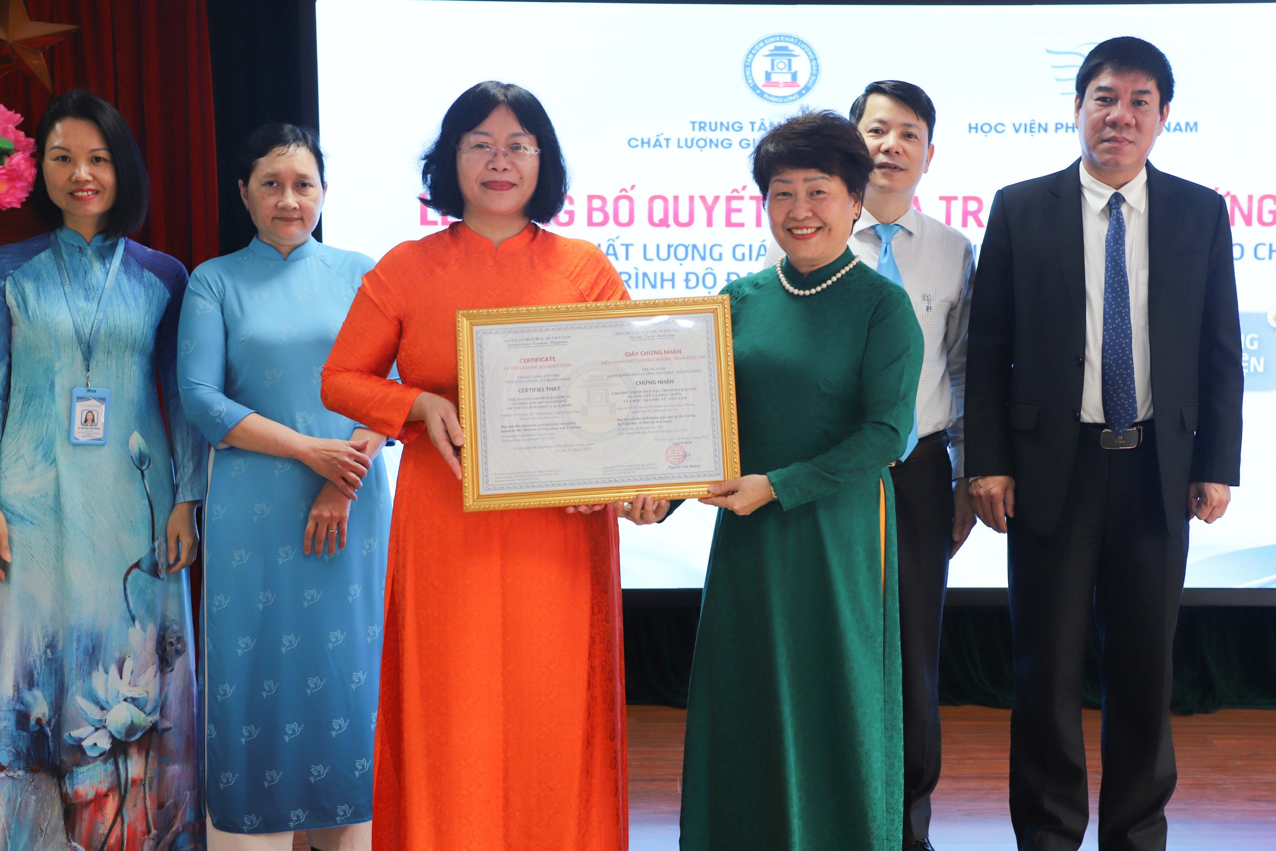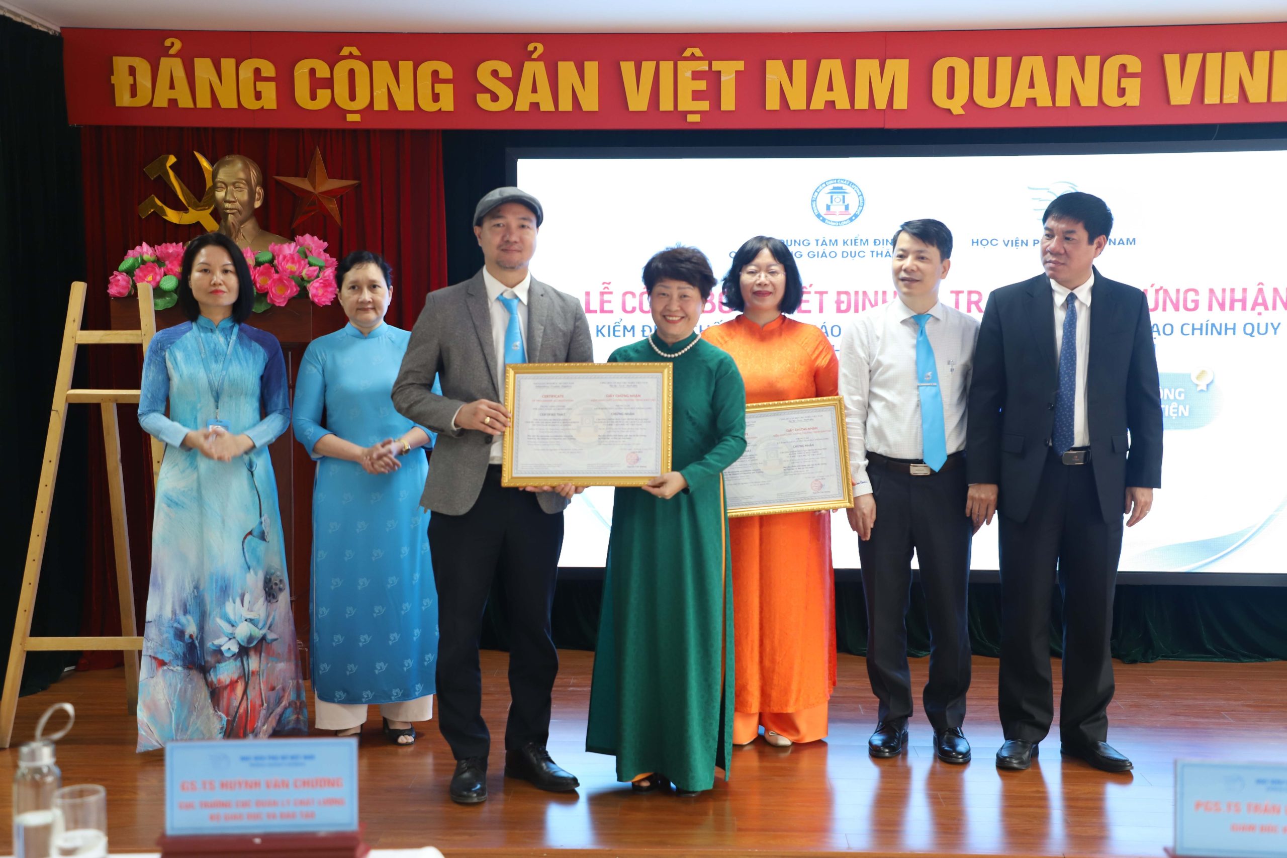 Buổi lễ có sự hiện diện của GS.TS. Huỳnh Văn Chương – Cục trưởng Cục Quản lý chất lượng, Bộ Giáo dục và Đào tạo, TS. Phí Thị Nguyệt Thanh – Phó Giám đốc Trung tâm Kiểm định chất lượng giáo dục Thăng Long, đại diện Trung ương Hội LHPN Việt Nam cùng Ban Giám đốc Học viện, các thầy cô, sinh viên và cựu sinh viên.