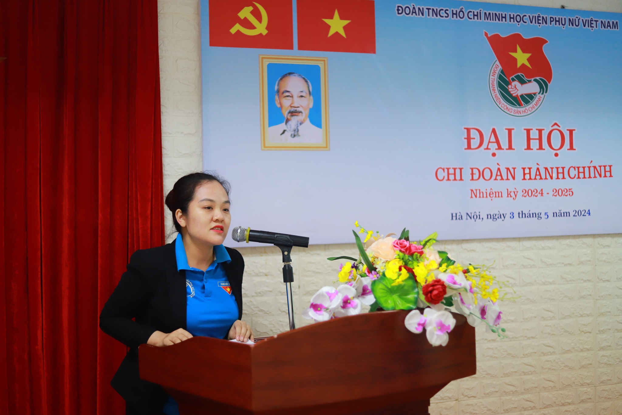 Phát biểu chỉ đạo tại Đại hội, đồng chí Nguyễn Hoàng Phương – Bí thư Đoàn Thanh niên Học viện đã ghi nhận, đánh giá cao và biểu dương những thành tích của Chi đoàn Hành chính trong nhiệm kỳ vừa qua. Đồng thời, đồng chí bày tỏ sự tin tưởng với đội ngũ đoàn viên chi đoàn với sự dân chủ, sáng tạo, năng động và xung kích trên tất cả các mặt hoạt động.