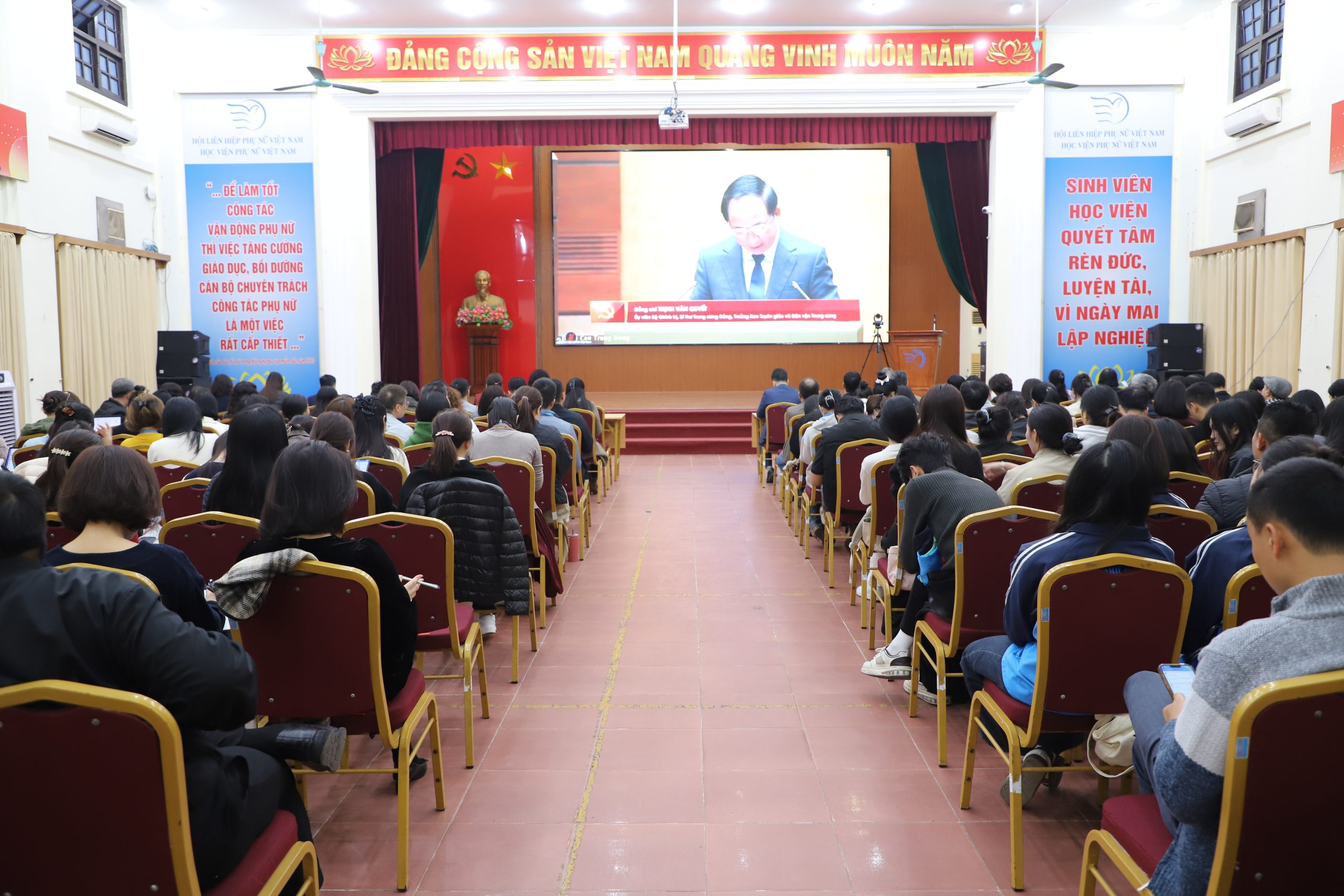 Tại điểm cầu Học viện Phụ nữ Việt Nam, hội nghị được tổ chức với tinh thần nghiêm túc, trách nhiệm cao, thu hút sự tham dự của PGS.TS. Trần Quang Tiến – Bí thư Đảng ủy, Giám đốc Học viện; các đồng chí trong Ban Thường vụ Đảng ủy cùng toàn thể đảng viên thuộc Đảng bộ Học viện. Không khí học tập, nghiên cứu diễn ra tập trung, thể hiện quyết tâm chính trị của toàn Đảng bộ trong việc nhanh chóng cụ thể hóa Nghị quyết vào thực tiễn công tác đào tạo, nghiên cứu khoa học và phục vụ cộng đồng.