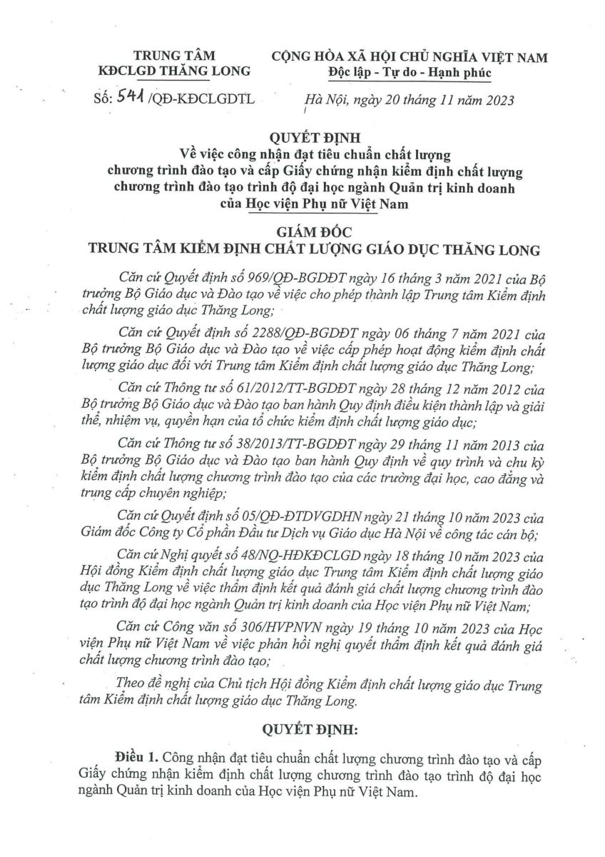 Dưới đây là Quyết định về việc đạt tiêu chuẩn chất lượng chương trình đào tạo và cấp Giấy kiểm định chất lượng chương trình đào tạo trình độ đại học ngành Quản trị kinh doanh, Học viện Phụ nữ Việt Nam.