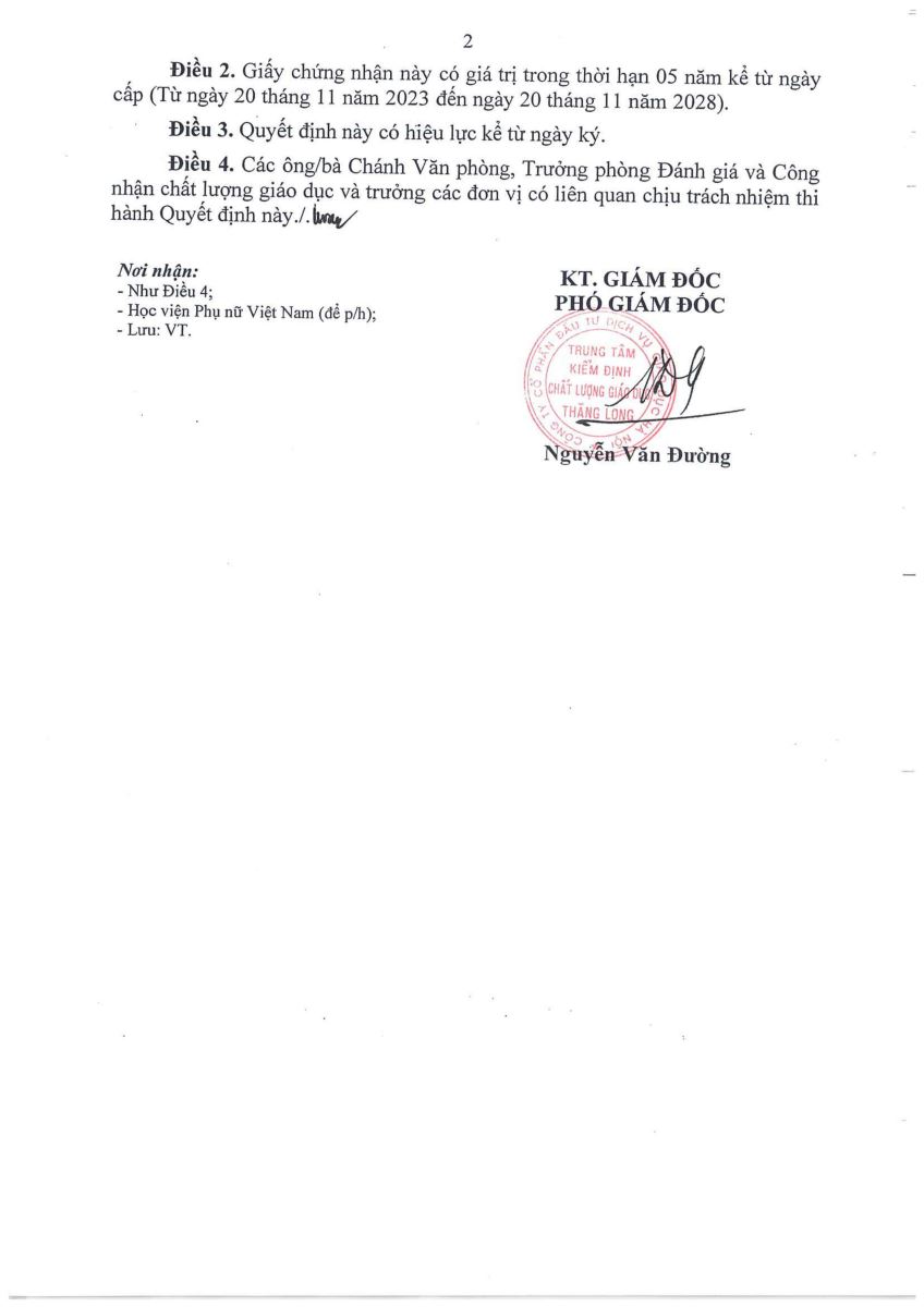 Học viện Phụ nữ Việt Nam và đại diện Trung tâm Kiểm định chất lượng giáo dục Thăng Long và đại diện Đoàn đánh giá ngoài đã thống nhất ký Biên bản hoàn thành chương trình khảo sát. Ngày 20/11/2023, Trung tâm Kiểm định chất lượng chất lượng giáo dục Thăng Long đã trao Giấy CN kiểm định cho 3 ngành Luật, Công tác xã hội và Quản trị kinh doanh.