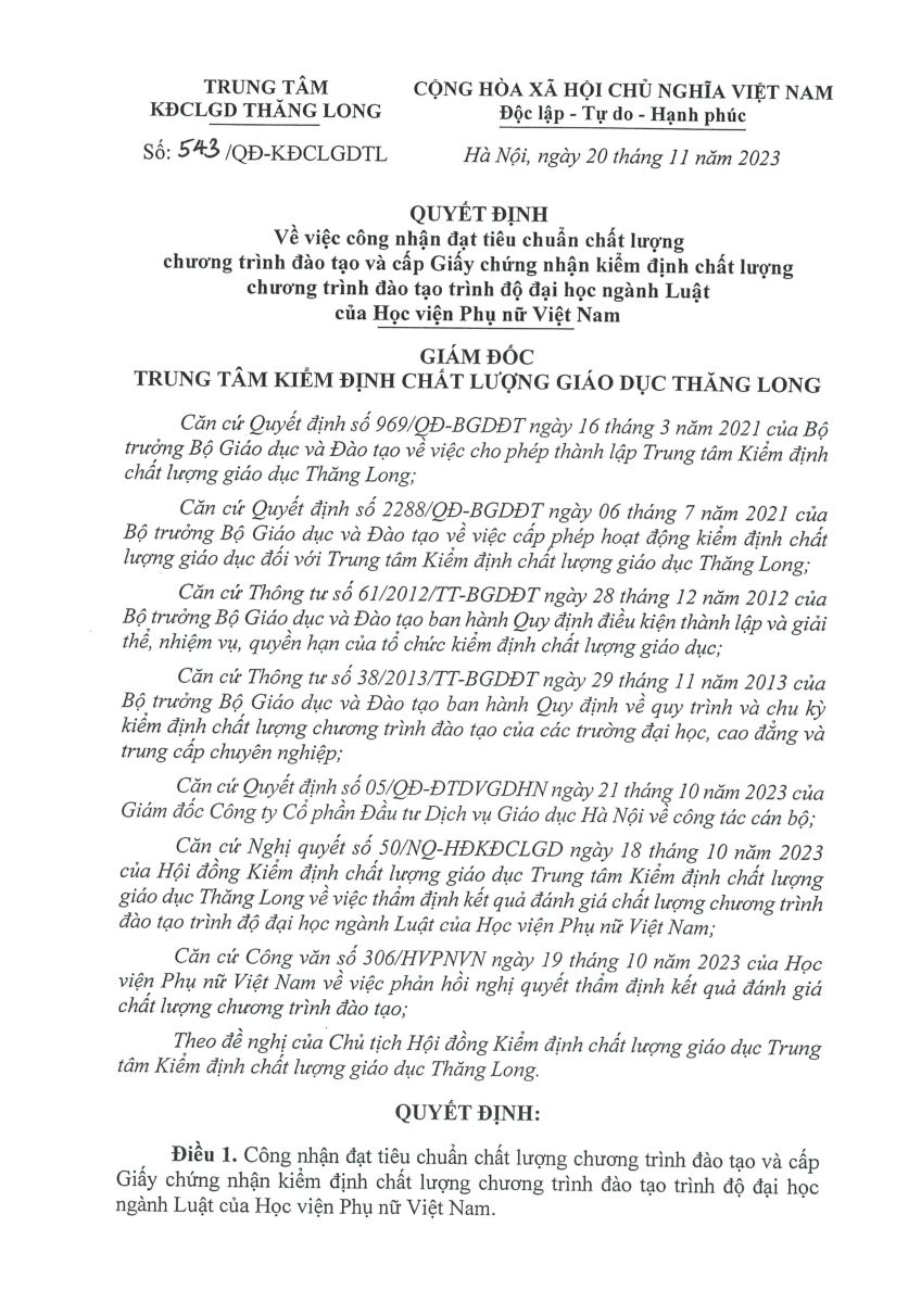 Dưới đây là Quyết định về việc đạt tiêu chuẩn chất lượng chương trình đào tạo và cấp Giấy kiểm định chất lượng chương trình đào tạo trình độ đại học ngành Luật, Học viện Phụ nữ Việt Nam.