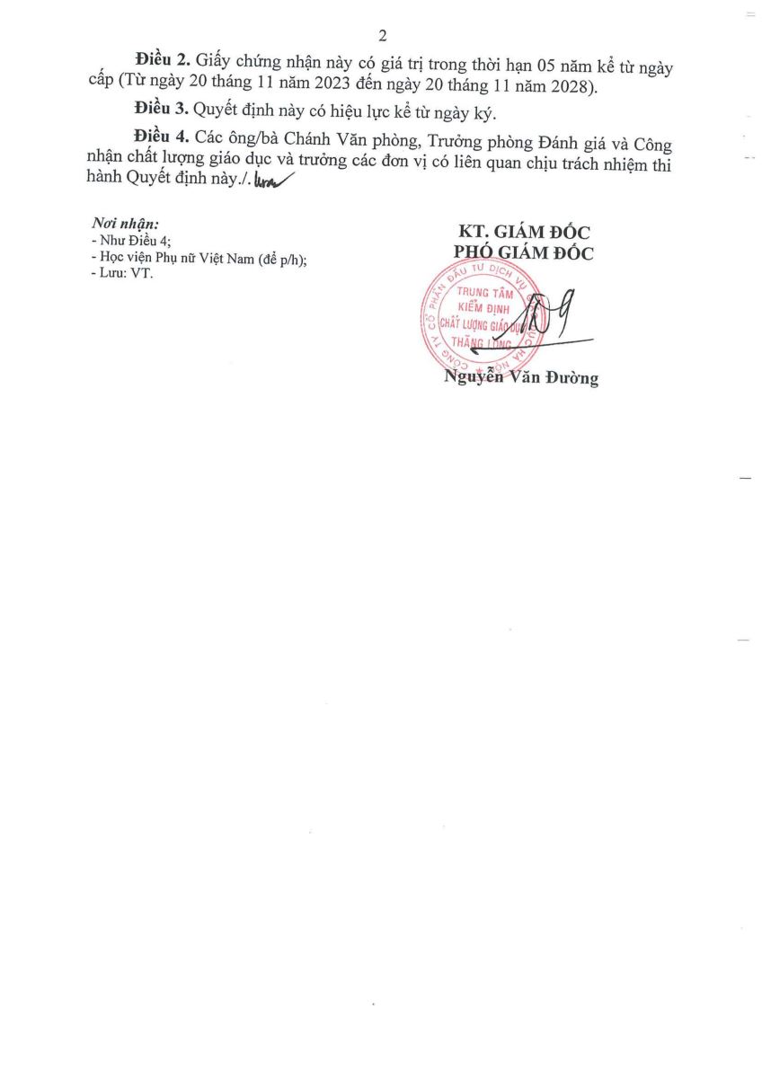 Học viện Phụ nữ Việt Nam và đại diện Trung tâm Kiểm định chất lượng giáo dục Thăng Long và đại diện Đoàn đánh giá ngoài đã thống nhất ký Biên bản hoàn thành chương trình khảo sát. Ngày 20/11/2023, Trung tâm Kiểm định chất lượng chất lượng giáo dục Thăng Long đã trao Giấy CN kiểm định cho 3 ngành Luật, Công tác xã hội và Quản trị kinh doanh.