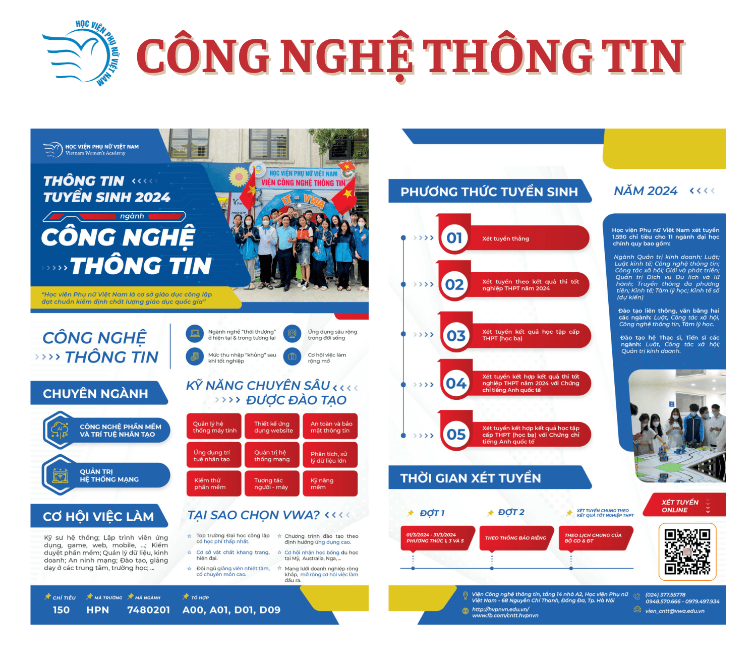 Năm 2024, Viện Công nghệ thông tin, Học viện Phụ nữ Việt Nam tuyển sinh 150 chỉ tiêu thuộc 02 chuyên ngành: Công nghệ phần mềm và trí tuệ nhân tạo; Quản trị hệ thống mạng. Đây đều là những lĩnh vực có cơ hội việc làm rộng mở, thu nhập tốt, đặc biệt trong thời đại công nghệ 4.0 như hiện nay.