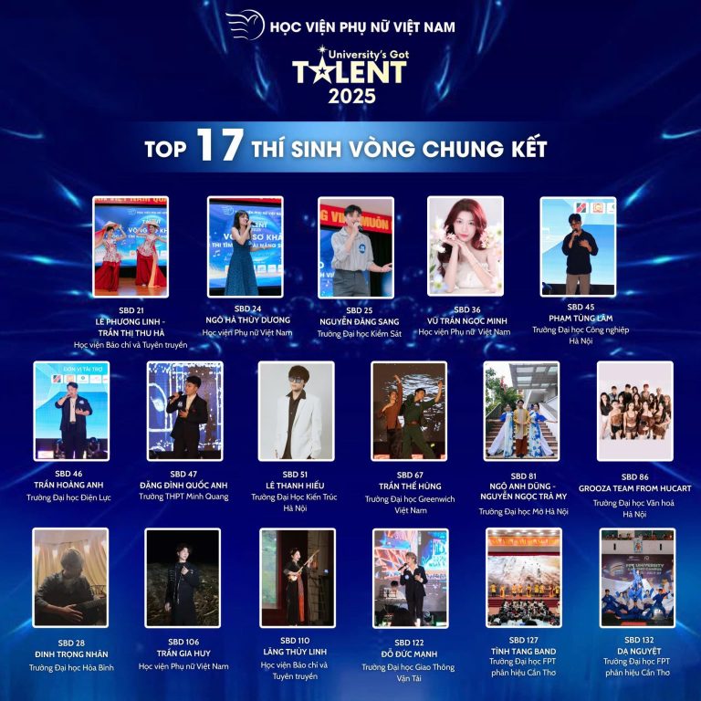 Sau đêm Bán kết đầy cảm xúc và bùng nổ tại Hội trường 1 – Học viện Phụ nữ Việt Nam, cuộc thi “Tìm kiếm tài năng sinh viên – University’s Got Talent 2025” đã chính thức bước sang một trang mới ghi danh Top 17 thí sinh/nhóm thí sinh xuất sắc lọt vào vòng Chung kết.
