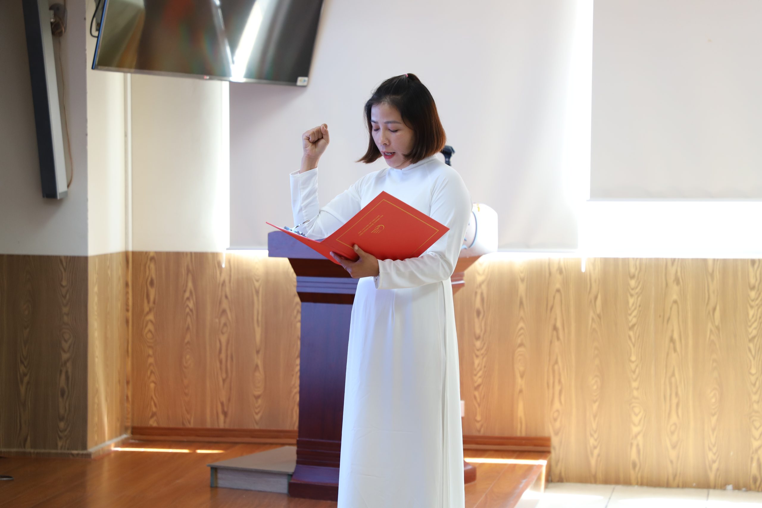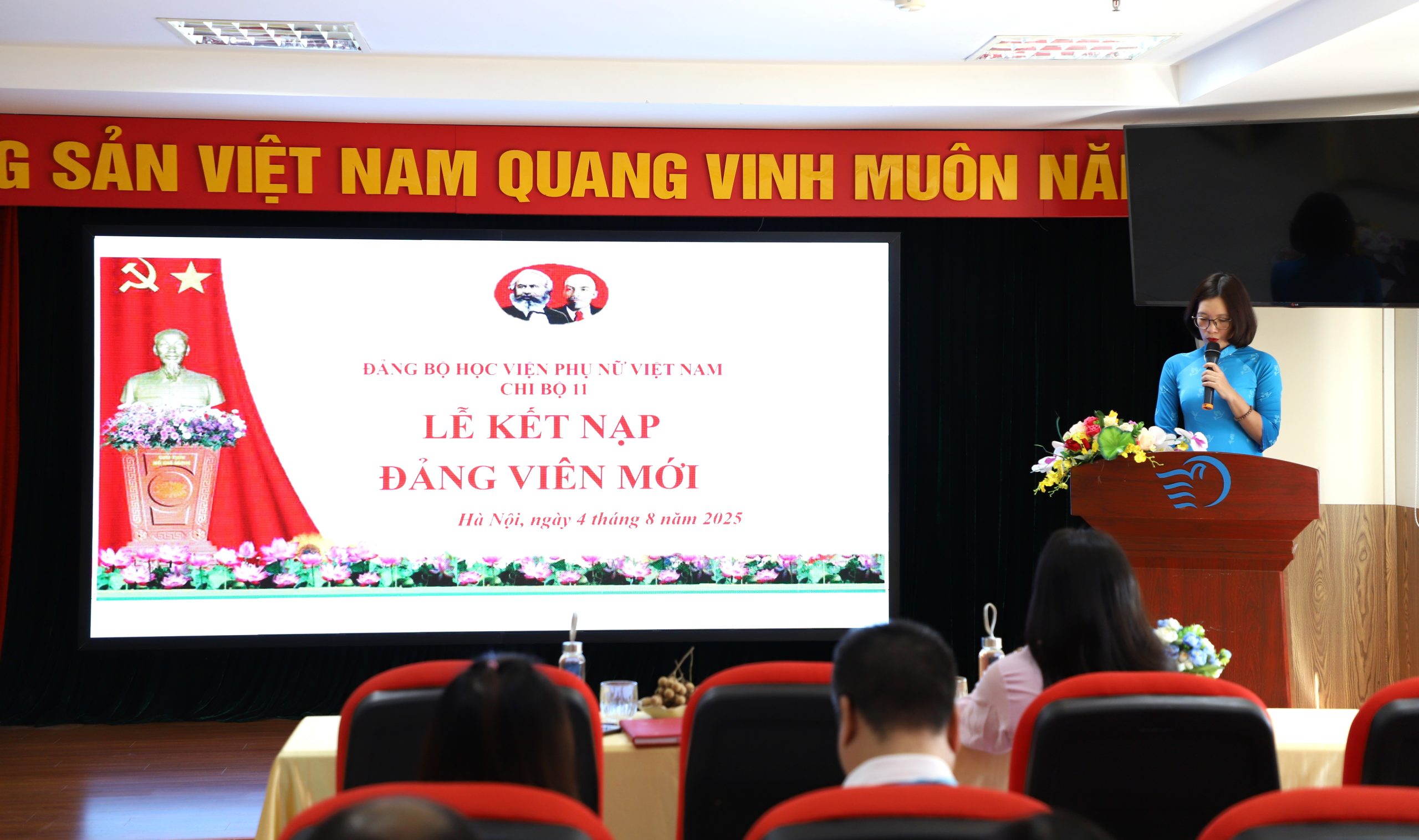 Mở đầu buổi lễ, đồng chí Trần Xuân Quỳnh – Phó Bí thư Chi bộ 11 đã công bố Quyết định kết nạp quần chúng Ngô Thị Oanh vào Đảng Cộng sản Việt Nam. Trong khoảnh khắc trang nghiêm, trước cờ Tổ quốc, cờ Đảng và chân dung Chủ tịch Hồ Chí Minh, đồng chí Ngô Thị Oanh đã đọc lời tuyên thệ của người đảng viên mới. Trong không khí xúc động, đồng chí thể hiện quyết tâm tuyệt đối trung thành với mục tiêu, lý tưởng của Đảng, không ngừng học tập, rèn luyện, nâng cao trình độ chuyên môn và bản lĩnh chính trị; sống, làm việc theo tấm gương đạo đức Hồ Chí Minh; đóng góp trí tuệ và sức lực cho sự phát triển của Học viện Phụ nữ Việt Nam cũng như sự nghiệp cách mạng của đất nước.