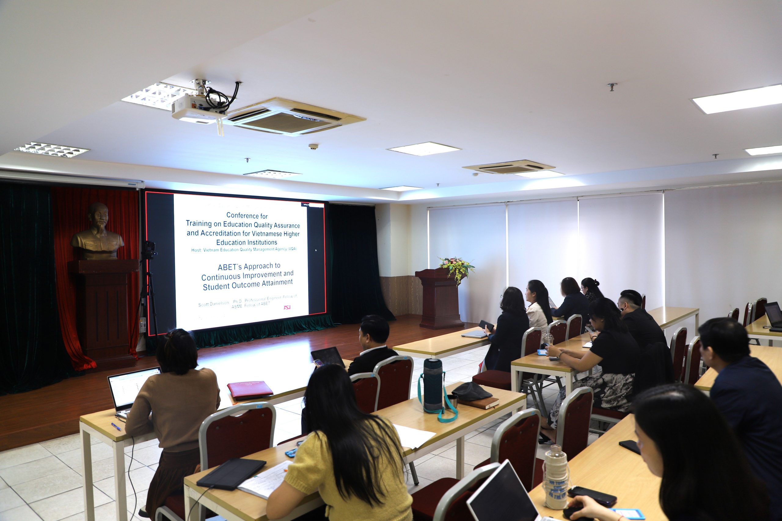 Hội nghị đã được nghe tham luận của các chuyên gia đến từ 02 tổ chức kiểm định quốc tế ABET và AUN-QA chia sẻ về kinh nghiệm đánh giá chuẩn đầu ra.