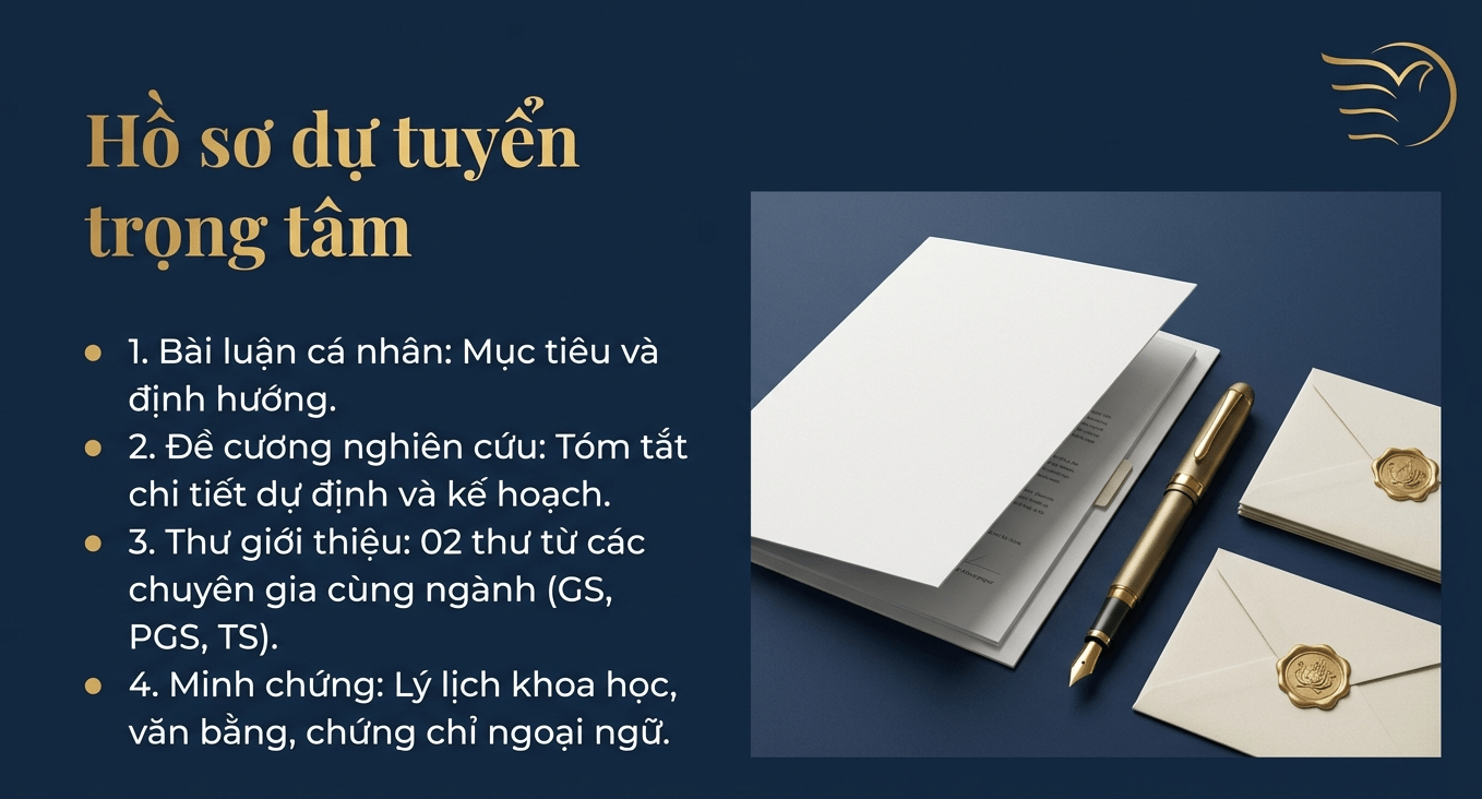 Trong đó, bài luận (800–1.200 từ) và đề cương nghiên cứu là nội dung trọng tâm, thể hiện rõ lý do lựa chọn đề tài, mục tiêu, phương pháp nghiên cứu, kế hoạch học tập và kinh nghiệm học thuật đã tích lũy. Đây là cơ sở quan trọng để đánh giá năng lực nghiên cứu độc lập và tiềm năng phát triển của ứng viên.
