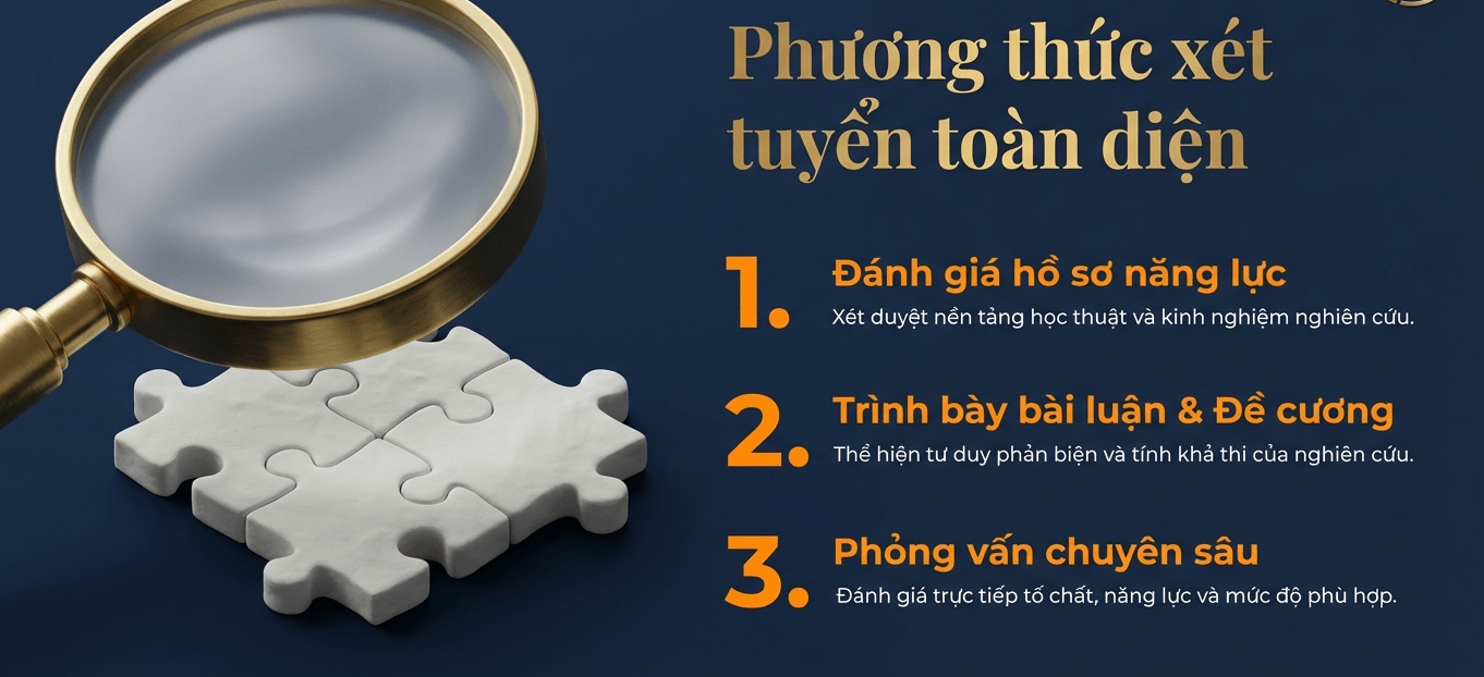 Học viện áp dụng phương thức xét tuyển thay cho thi viết truyền thống, tiệm cận cách thức tuyển chọn nghiên cứu sinh của nhiều cơ sở đào tạo quốc tế. Quy trình gồm: