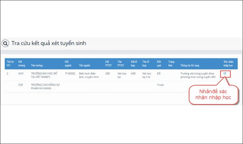 Ngay cạnh nguyện vọng trúng tuyển, hệ thống sẽ hiển thị biểu tượng Xác nhận. Thí sinh cần nhấn vào biểu tượng này để bắt đầu quy trình xác nhận nhập học.