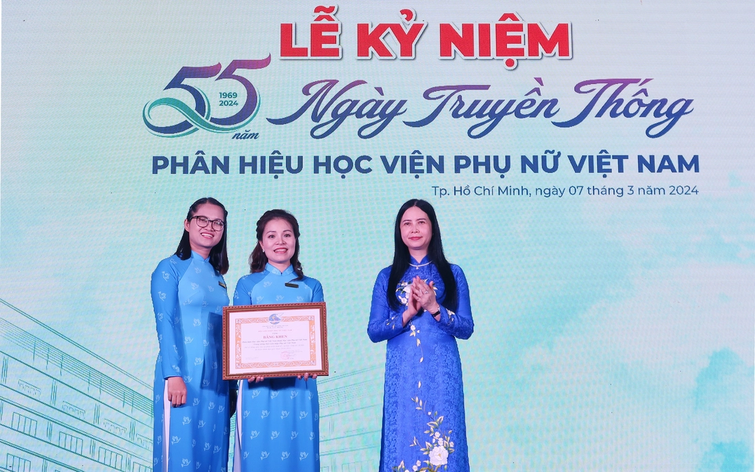 Thừa ủy quyền của Chủ tịch Hội LHPN Việt Nam, bà Trần Lan Phương (bìa phải), Phó Chủ tịch Hội LHPN Việt Nam, tặng Bằng khen của TƯ Hội cho tập thể Phân hiệu Học viện Phụ nữ Việt Nam nhân dịp kỉ niệm 55 năm thành lập (2024)