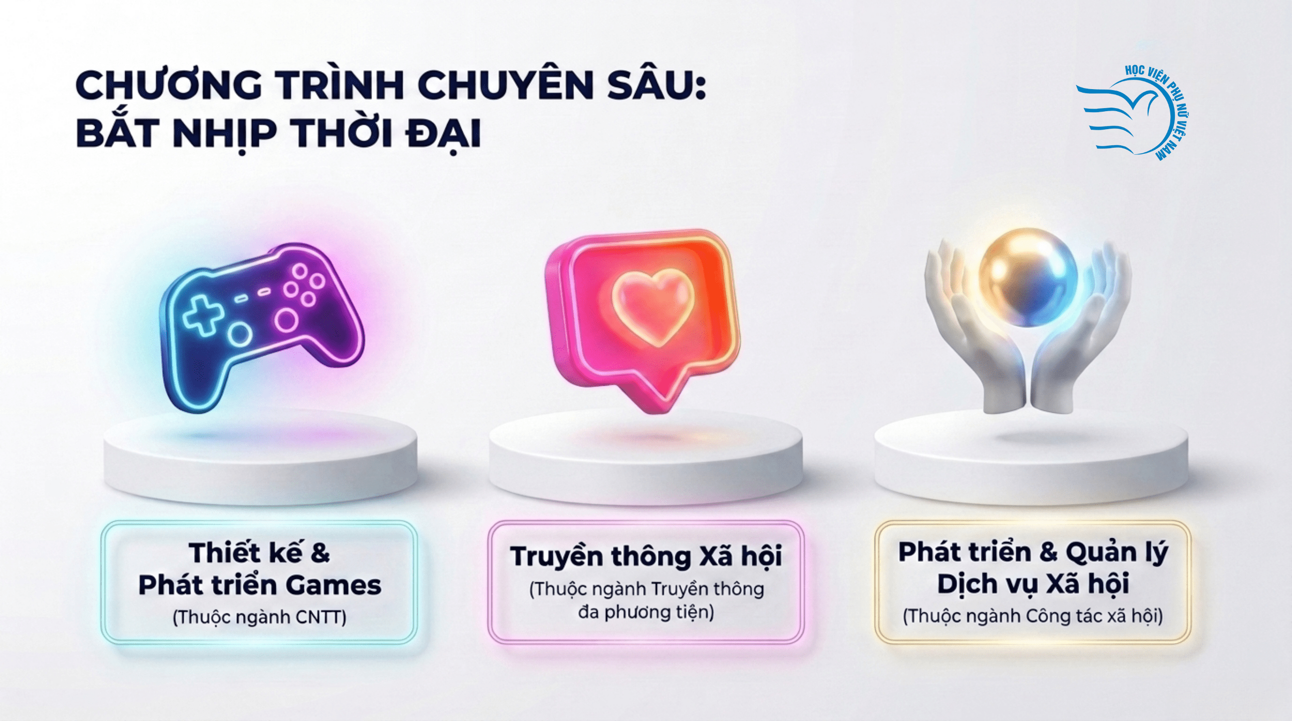 Ở khối ngành khoa học xã hội, ngành Công tác xã hội cũng được mở rộng với chương trình Phát triển và quản lý dịch vụ xã hội. Đây là lĩnh vực đang được quan tâm trong bối cảnh các dịch vụ an sinh, chăm sóc cộng đồng và hỗ trợ các nhóm yếu thế ngày càng được chú trọng trong xã hội hiện đại. Việc bổ sung các chương trình chuyên sâu cho thấy nỗ lực của Học viện trong việc gắn kết đào tạo với nhu cầu thực tiễn, thay vì chỉ duy trì các chương trình đào tạo truyền thống.