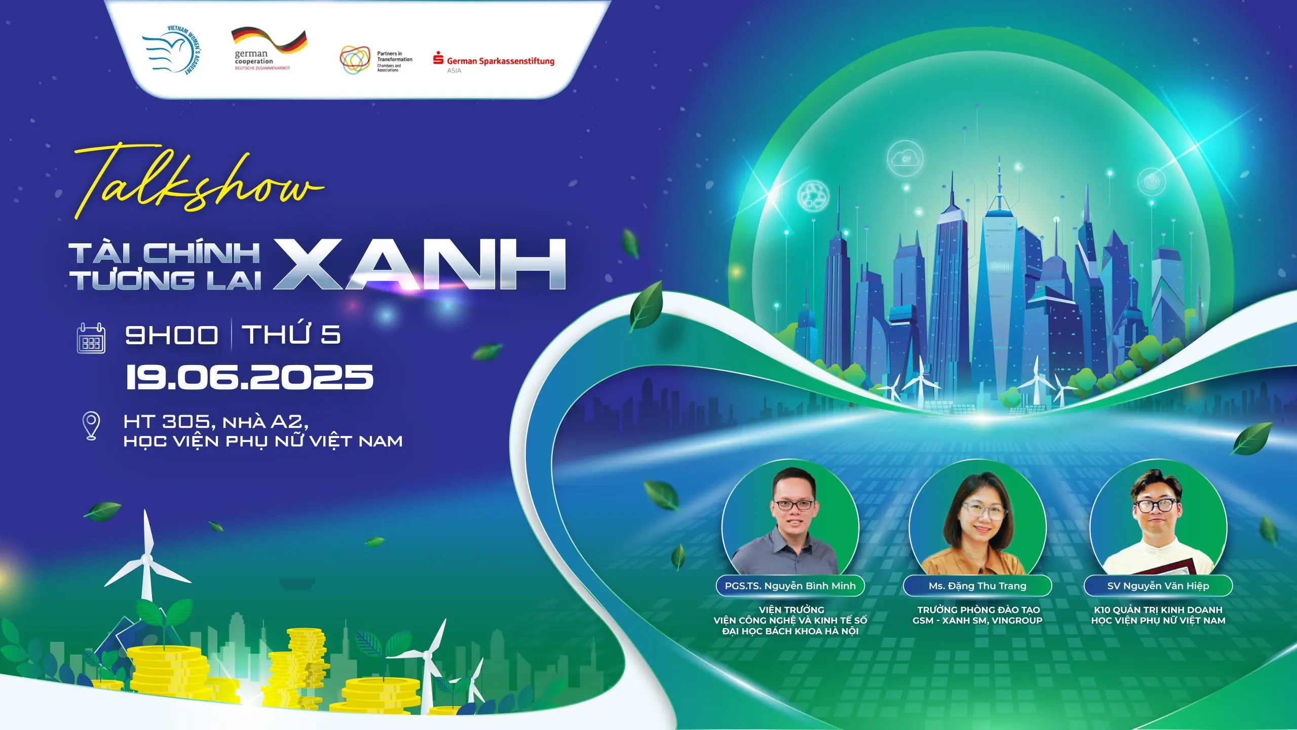 Trong khuôn khổ hợp tác giữa Học viện Phụ nữ Việt Nam và Quỹ Hợp tác quốc tế các ngân hàng tiết kiệm Đức (DSIK) giai đoạn 2024–2027, chương trình Talkshow với chủ đề “Tài chính xanh – Tương lai xanh” sẽ được tổ chức vào 9h00 sáng thứ Năm, ngày 19/6/2025 tại Hội trường 305 – Học viện Phụ nữ Việt Nam. Trong bối cảnh biến đổi khí hậu và các vấn đề môi trường ngày càng đặt ra nhiều thách thức, việc ứng dụng tài chính xanh không chỉ là lựa chọn cá nhân mà còn là một hướng đi quan trọng trong chiến lược xây dựng một cộng đồng xanh, phát triển bền vững và nhân văn. Talkshow được kỳ vọng sẽ là cầu nối giữa tri thức, trải nghiệm thực tiễn và hành động cụ thể, đặc biệt là với giới trẻ – những người giữ vai trò trung tâm trong hành trình kiến tạo tương lai. Nội dung talkshow xoay quanh các chủ đề cốt lõi: khái niệm và giá trị của tài chính xanh, khả năng ứng dụng vào đời sống sinh viên, mô hình khởi nghiệp xanh và hành trình xây dựng cộng đồng tài chính xanh tại các cơ sở giáo dục.