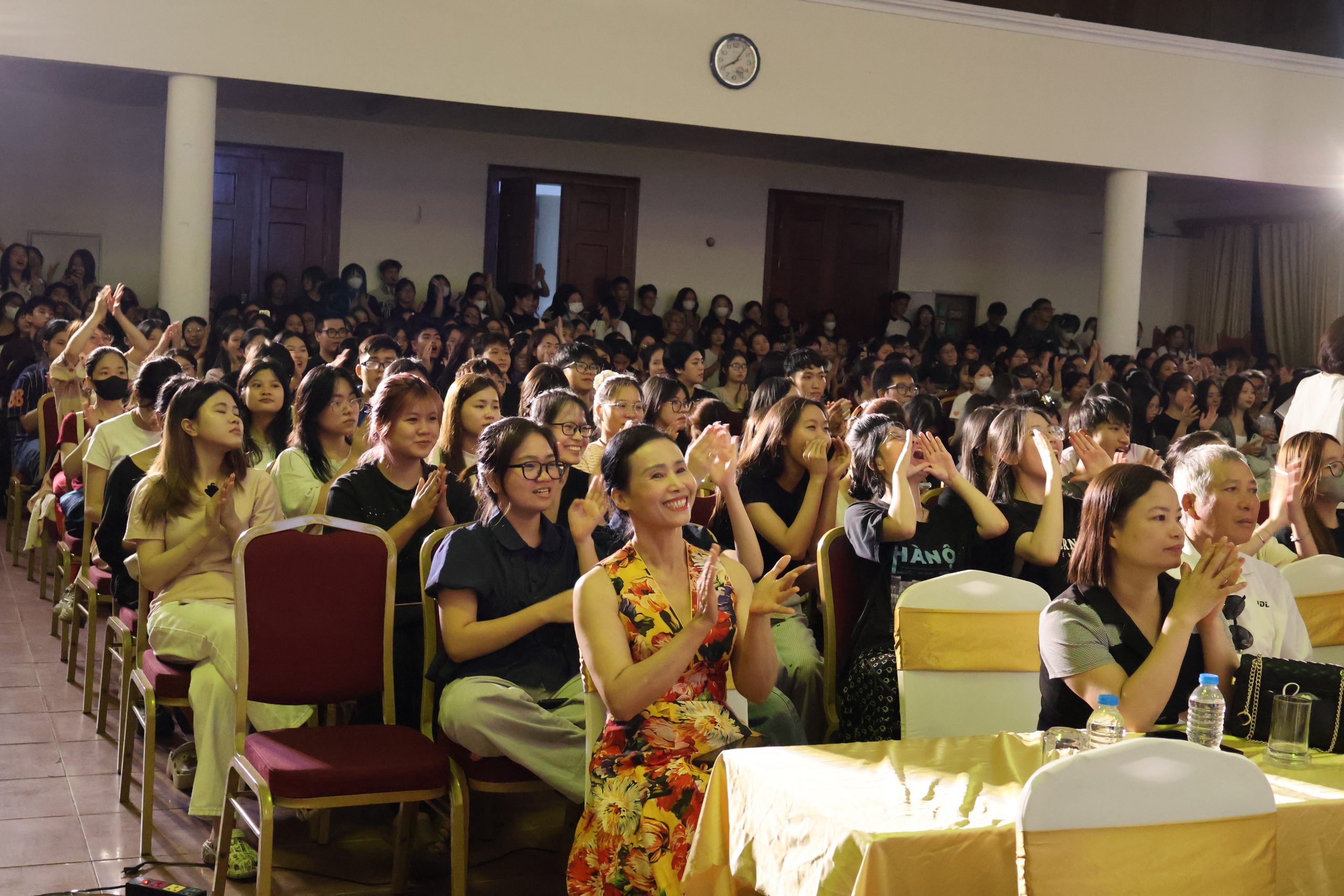 Không khí trong hội trường luôn được hâm nóng bởi sự cổ vũ nồng nhiệt của hàng trăm sinh viên, bạn bè và người thân. Những tràng pháo tay vang dội, những tiếng hò reo sôi động đã trở thành nguồn động lực tiếp thêm sức mạnh để thí sinh tỏa sáng trên sân khấu. Xen kẽ giữa các phần thi, MC khéo léo dẫn dắt, giao lưu với Ban giám khảo và khán giả, mang lại những giây phút gần gũi, thoải mái và tràn đầy năng lượng.