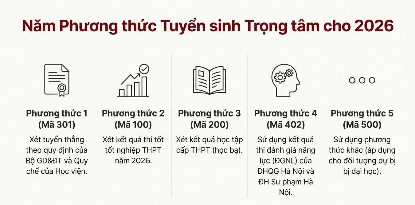Trong bối cảnh dự thảo Quy chế tuyển sinh 2026 có nhiều điểm mới, Học viện Phụ nữ Việt Nam tiếp tục áp dụng đa dạng phương thức xét tuyển để tạo điều kiện thuận lợi cho thí sinh. Các phương thức dự kiến gồm: Xét tuyển thẳng theo quy định; Xét kết quả thi tốt nghiệp THPT; Xét học bạ THPT; Xét kết quả các kỳ thi đánh giá năng lực do Đại học Sư phạm và Đại học Quốc gia Hà Nội tổ chức và phương thức riêng dành cho người học dự bị đại học, nhằm mở rộng cơ hội phấn đấu vào đại học cho nhiều đối tượng thí sinh.