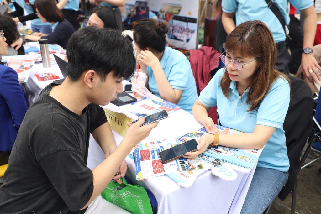 Cán bộ Học viện Phụ nữ Việt Nam tư vấn cho thí sinh đăng ký xét tuyển sớm online tại Ngày hội tư vấn tuyển sinh hướng nghiệp 2024